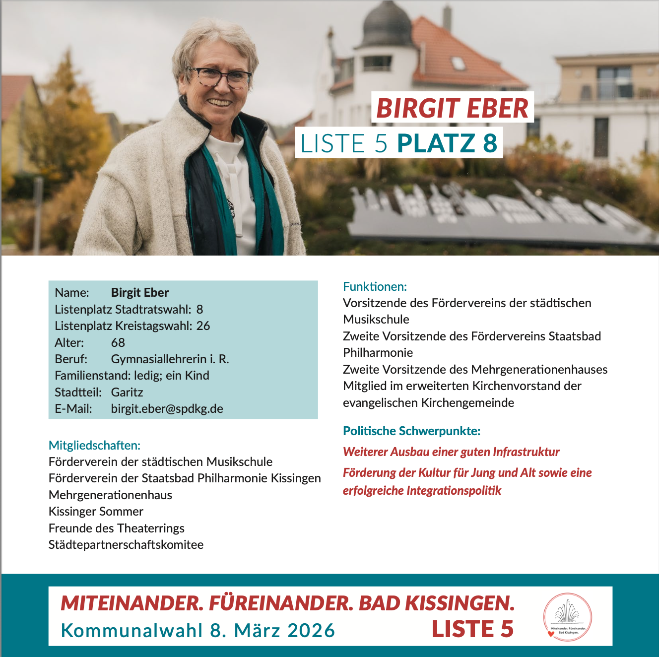 Sie sind hier: Start › Wahlen › Stadtratswahl › Miteinander. Füreinander. Bad Kissingen. › Birgit Eber