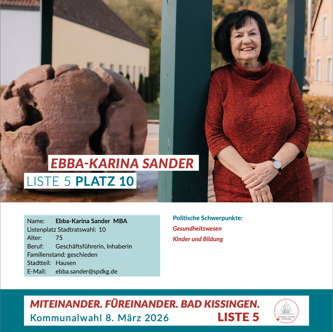 Sie sind hier: Start › Wahlen › Stadtratswahl › Miteinander. Füreinander. Bad Kissingen. › Ebba-Karina Sander