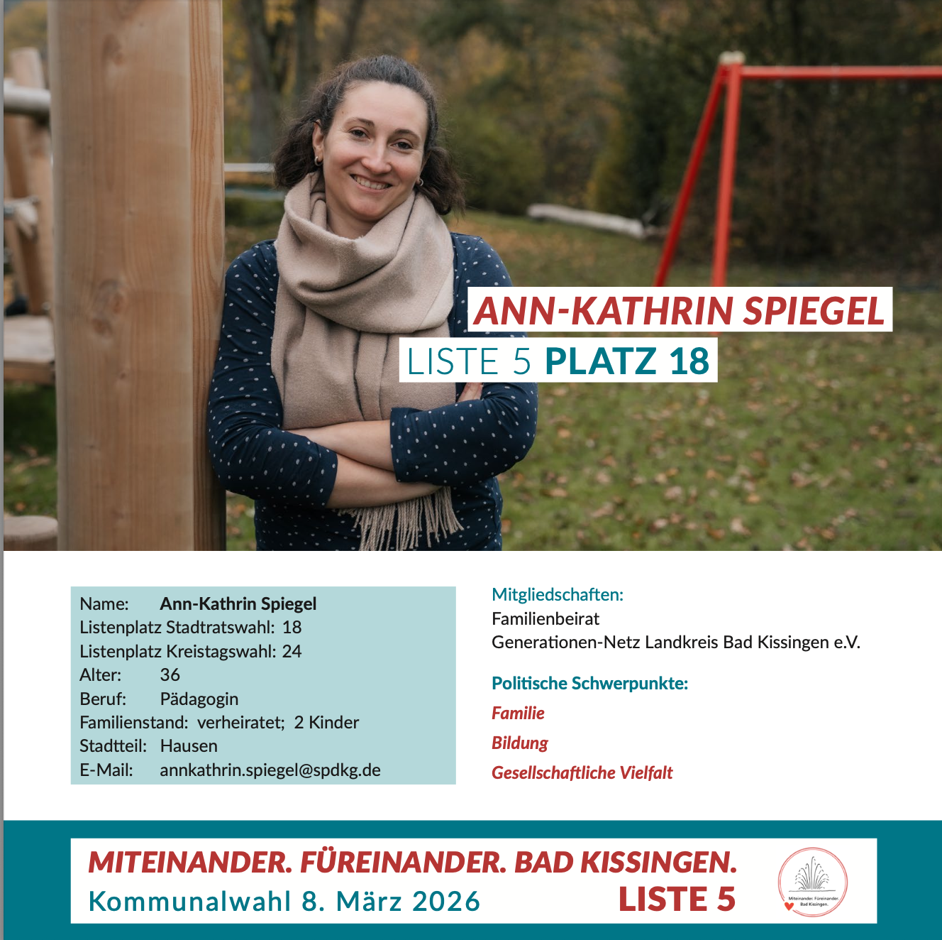 Sie sind hier: Start › Wahlen › Stadtratswahl › Miteinander. Füreinander. Bad Kissingen. › Ann-Kathrin Spiegel