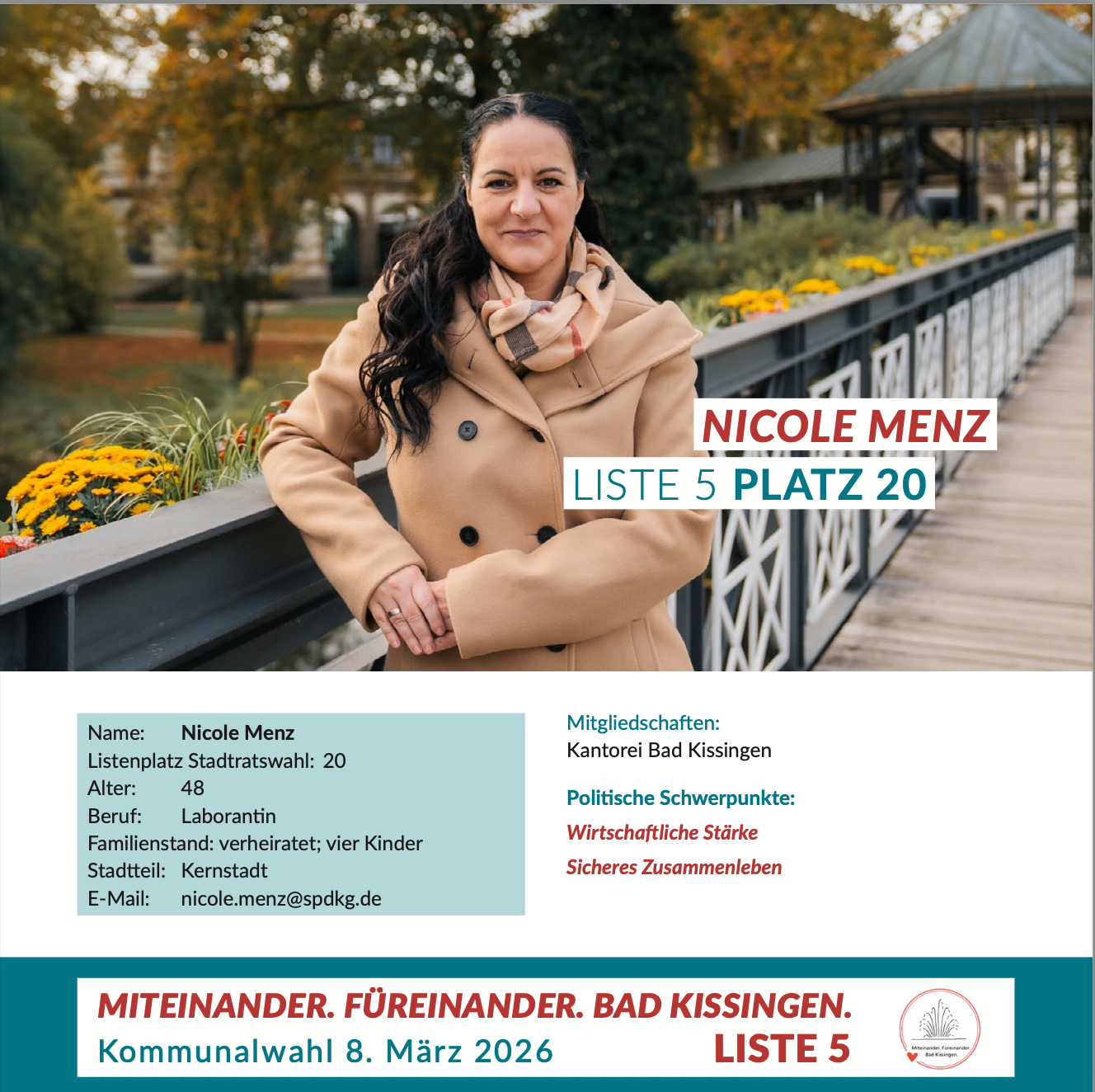 Sie sind hier: Start › Wahlen › Stadtratswahl › Miteinander. Füreinander. Bad Kissingen. › Nicole Menz