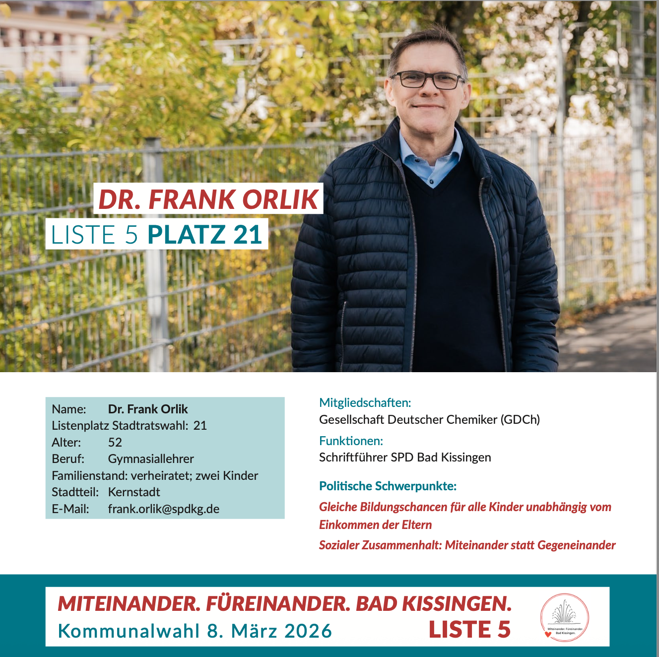 Sie sind hier: Start › Wahlen › Stadtratswahl › Miteinander. Füreinander. Bad Kissingen. › Dr. Frank Orlik