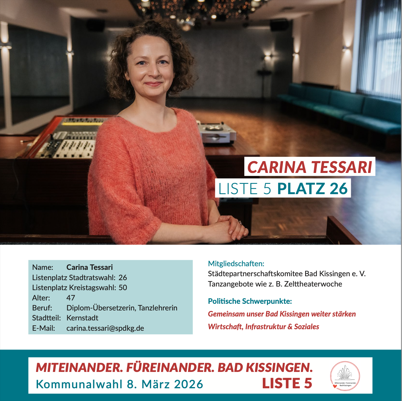 Sie sind hier: Start › Wahlen › Stadtratswahl › Miteinander. Füreinander. Bad Kissingen. › Carina Tessari